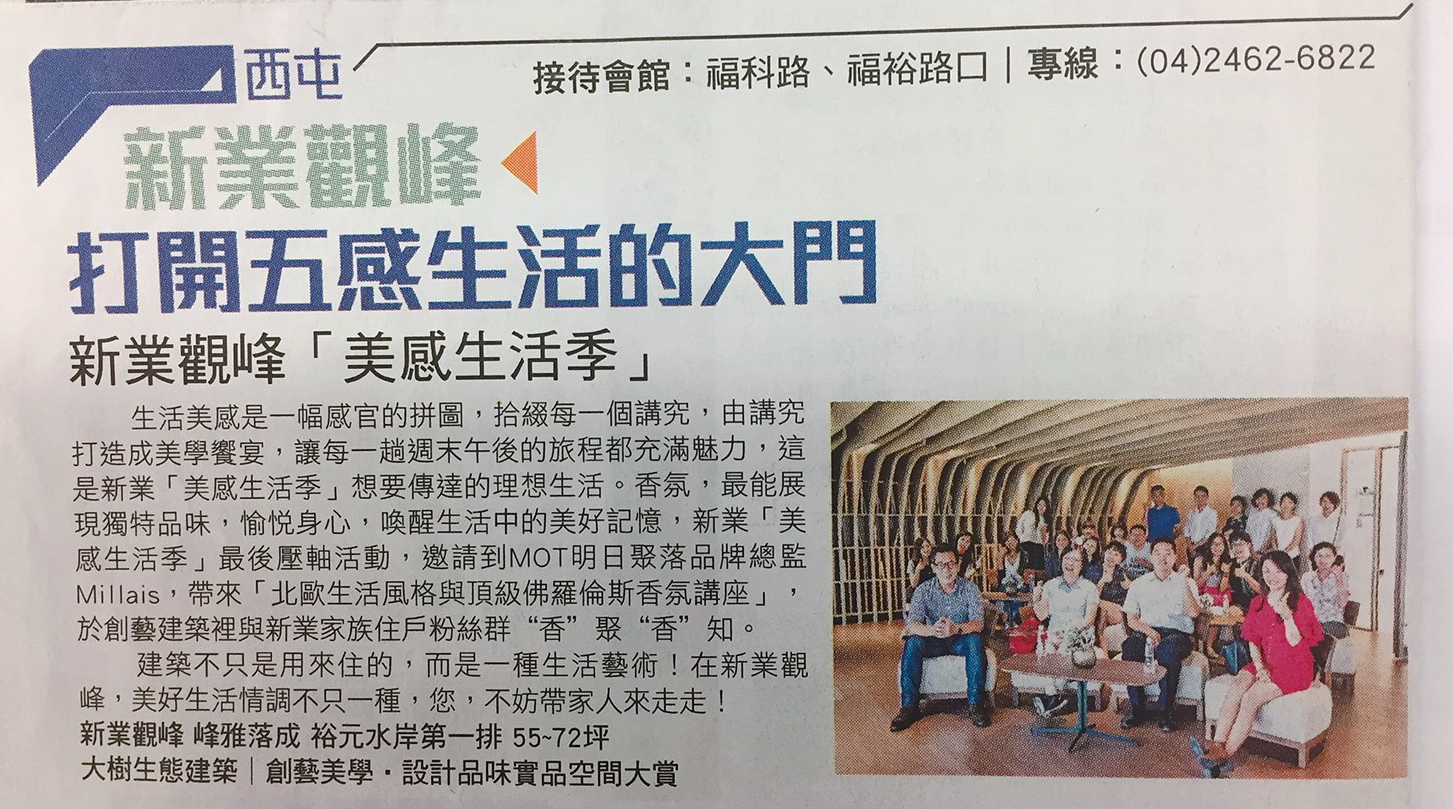 香氛,最能展現(xiàn)獨(dú)特品味,愉悅身心,喚醒生活中的美好記憶,新業(yè)「美感生活季」最後壓軸活動(dòng),邀請(qǐng)到MOT明日聚落品牌總監(jiān)Millais,帶來「北歐生活風(fēng)格與頂級(jí)佛羅倫斯香氛講座」,於創(chuàng)藝建築裡與新業(yè)家族住戶粉絲群“香”聚“香”知。