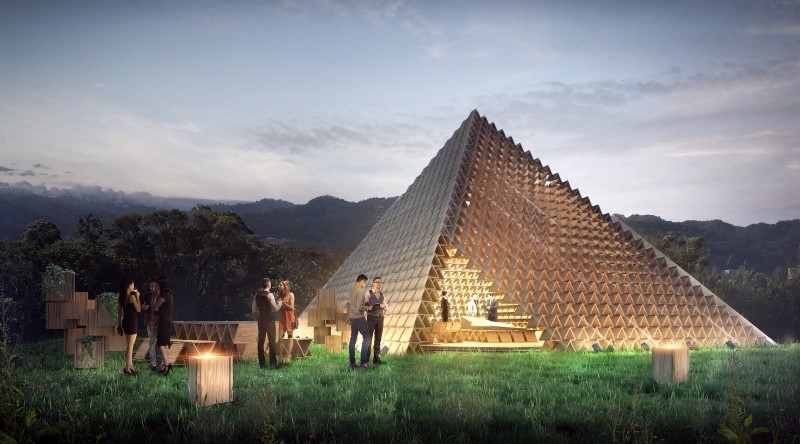 積木概念館以積木形式表現(xiàn)「童趣」,木構(gòu)造建材則展示「綠生活」,兩大核心精神運(yùn)用三角積木作為建築結(jié)構(gòu)與造型,打破建築普遍以直角與水平角度為主的形式,變身為此次臺(tái)中花博的木造金字塔。