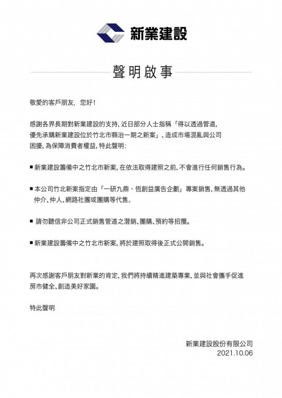感謝各界長(zhǎng)期對(duì)新業(yè)建設(shè)的支持,近日部分人士指稱「得以透過管道,優(yōu)先承購新業(yè)建設(shè)位於竹北市縣治一期之新案」,造成市場(chǎng)混亂與公司困擾,為保障消費(fèi)者權(quán)益,特此聲明: